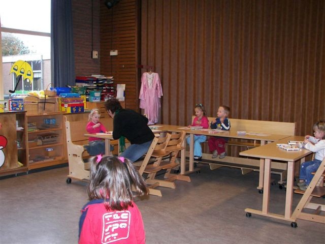 Nog steeds is het een beetje behelpen voor de peutertjes. Één van de peuters noemde het zelfs een schuur. Het zaaltje (een gedeelte van de grote zaal) is zo gezellig mogelijk ingericht maar regelmatig moet de peuterleidster de hele zaal “verbouwen” omdat er ook andere activiteiten in dat gedeelte van de zaal zijn.