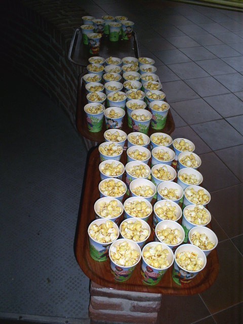 Tussendoor, in de pauze, werden de kinderen ook nog getrakteerd op allerlei lekkernijen. Kerstkranskoekjes, chocolade kransjes, ranja en zoals ze dat in een echte bioscoop ook hebben, een beker met lekkere popcorn.