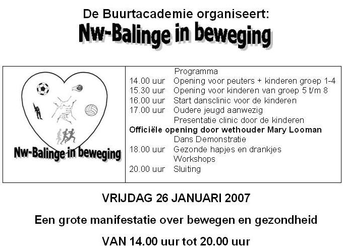 Agenda: 1) Opening 2) Notulen jaarvergadering 26-01-2006. 3) Ingekomen stukken 4) Verslag penningmeester 5) Verslag kascommissie 6) Bestuursverkiezing: Aftredend en herkiesbaar: dhr H. Prins en dhr G. Dijkhuis. Tegen- kandidaten kunnen 3 dagen voor de vergadering ingeleverd worden bij de secretaris A. Wielink. 7) Rondvraag. 8) Sluiting. Secr: A. Wielink, Voornweg 10, 7938 RC Nw-Balinge
