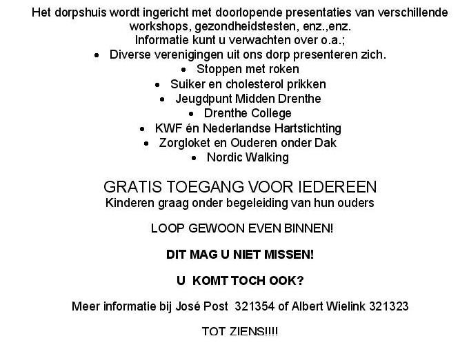 Wij danken een ieder voor het kopen van de loten. Langs deze weg willen wij iedereen een gezellige kerst toewensen en een heel gelukkig 2007. Uitslag verloting Kinderclub1e prijs R. Wobben, Vosseveen 38, Nr. 2351 2e prijs H. van Tongeren, Breistroekenweg 13, Nr. 1734 3e prijs H. Kreeft, Haarweg 3, Nr. 1333 4e prijs A. Goossens, Schepersweg, Nr. 1176 5e prijs B. van Burg, Mantingerweg, Nr. 1218 6e prijs H. Prins, Schepersweg 8, Nr. 1994 7e prijs J. Pol, Robertusweg 3, Nr. 1211 8e prijs J. Stuifzand, Kievitstraat, Nr. 1035 9e prijs J. Vos, Verl. Middenraai 63, Nr. 2310 10e prijs R. Bisschop, Mantingerweg 1. Nr. 2273 11e prijs N. Brookman, Vosseveen 4, Nr. 2220 12e prijs H. Profijt, Hoogeveen, Nr. 1862 13e prijs H. van Trigt, Haarweg 30, Nr. 2342 14e prijs Mennink, Westerbork, Nr. 1066 15e prijs Jonker, De Breistroeken, Nr. 1752 16e prijs D. Eisinga, Hoogeveen, Nr. 1475 Een advertentie in het kontakt had onze aandacht getrokken. “Open Huis bij Thuishuis Vlinder, kleinschalige en flexibele Kinderopvang”. Uit de folder Stichting Thuishuis heeft een franchiseformule ontwikkeld, waarbij professionele kinderopvang aan huis mogelijk is. Stichting Thuishuis speelt hiermee in op de groeiende vraag naar kinderopvang met name in plattelandsgebieden en richt zich hierop de drie noordelijke provincies. Zo togen wij op zaterdagmiddag naar de Schepersweg 1. Wij wilden hier wel eens meer van weten. Door de ballonnen in de tuin was het voor ons gemakkelijk te herkennen. Het was al een drukte van belang.