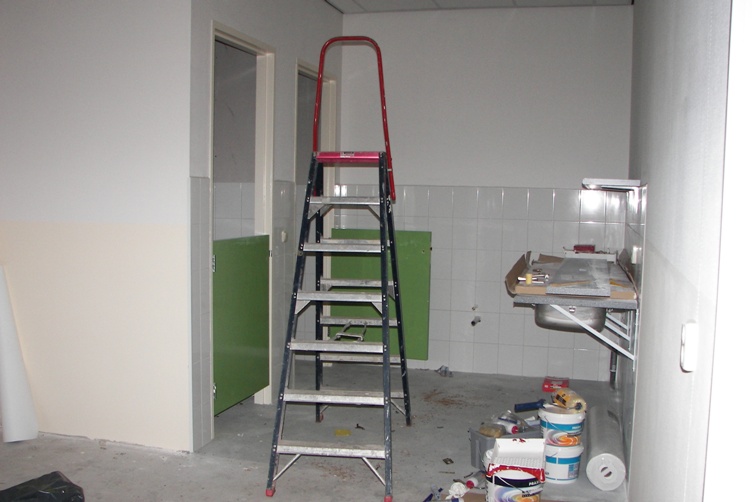 en er zijn al enkele dingen geverfd. In lekkere gezellige en frisse kleurtjes. Echt heel mooi zo’n nieuw lokaal. Als alles klaar is zullen de kleutertjes zich er prima kunnen vermaken.
