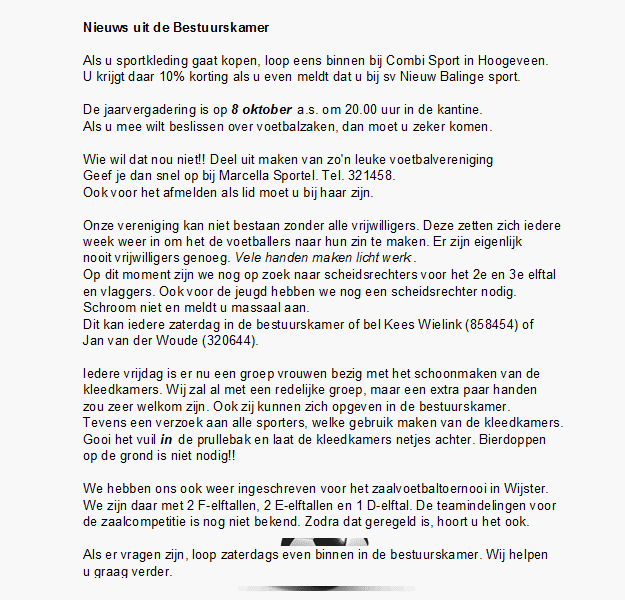 SV-Nieuw Balinge nodigt haar leden uit voor de